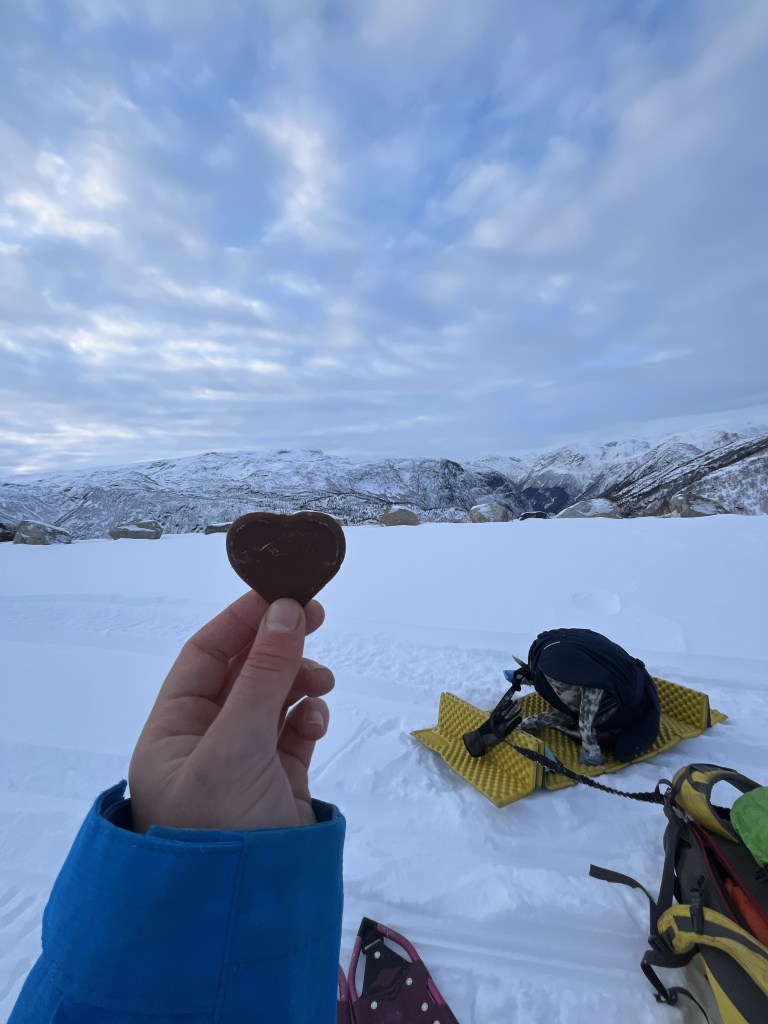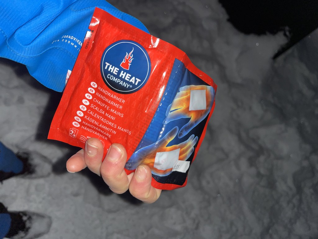 Starting strong: It is dark at the start. We go over the map together and sign our lives away (the good old liability form). There is a little store at the start to where Sigrid requires a couple to buy better mittens. I buy some hand-warmers because I have Raynaud’s syndrome, and every winter outing needs some hand-warmers. Then, Sigrid gives us all snow shoes, spikes, headlamps, and …. sleds? Turns out that we are dragging sleds for first 4km. It is a pain for the start, but Sigrid promises it is worth it for the way down.