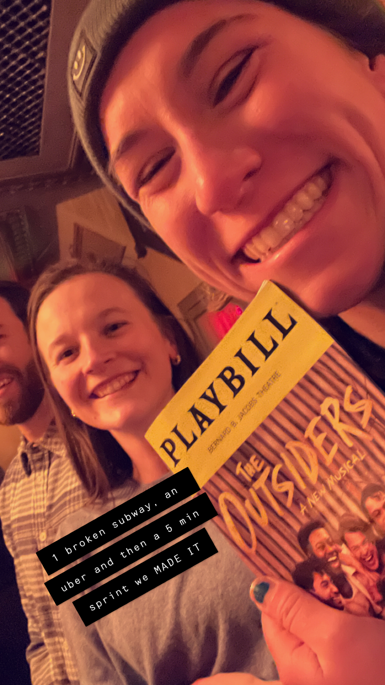 I also got to see the Tony Winning Broadway Musical, “The Outsiders”. Even better, I got to see a familiar face in the show! Jason Schmidt (from Arlington Heights, IL) is currently playing SodaPop Curtis! It is soooo cool to see someone I know kicking ass in the arts! Also though, I am mind blown by how many people I know/knew who are doing big things in theater and music. If you wind up in the big apple, I highly recommend seeing this show. It is so popular, frequently selling out , with tickets that can be up to $500+. However, there are rush and lottery tickets, and I stood in the back for $45. From there, I could see everything, and I still felt all the feels. When Johnny Cade whispers “Stay Gold”, it’s hard NOT to cry.